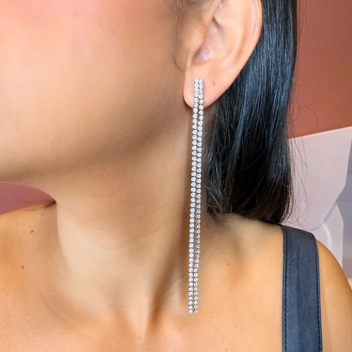 Brinco Longo Ródio Branco Estilo Riviera com Zircônias